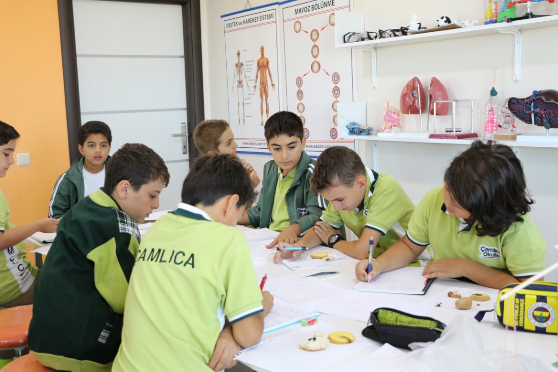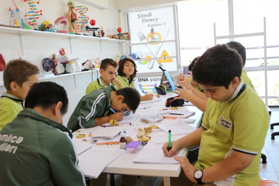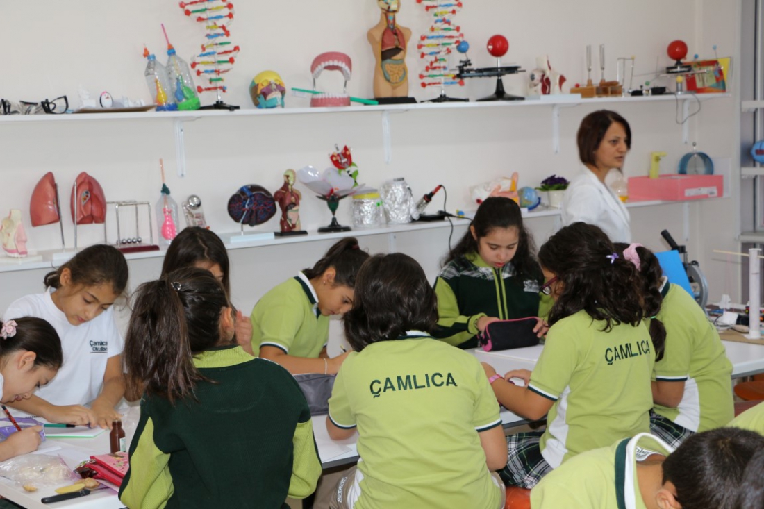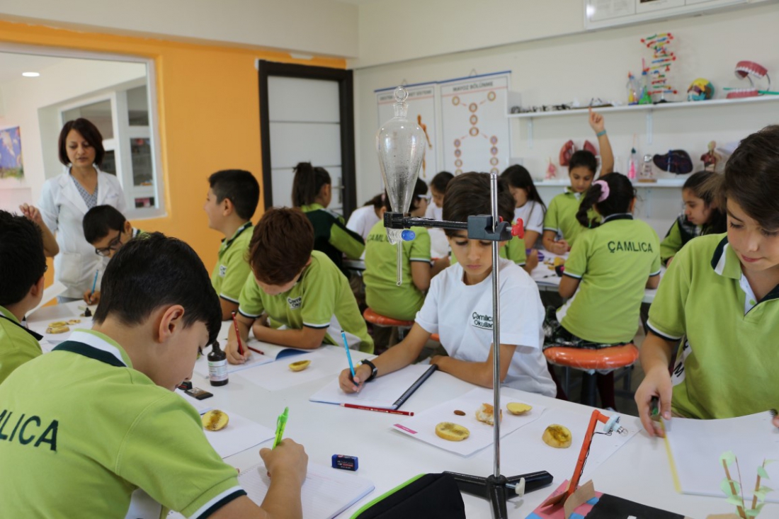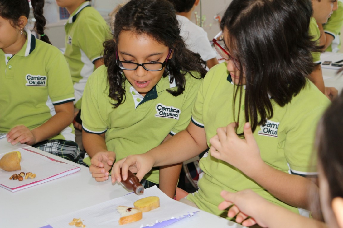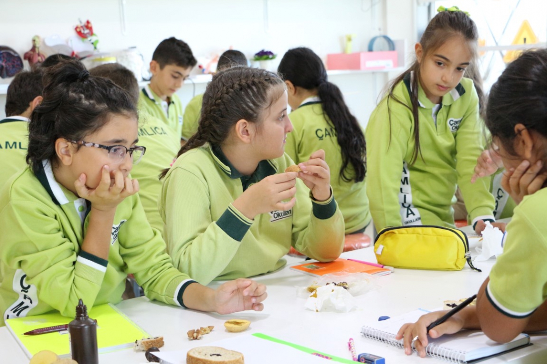 Çamlıca Okullarında öğrenciler Fen Bilimleri dersinde DNA laboratuvarında besinlerin içeriklerini iyot çözeltisi, nitrik asit gibi kimyasallar kullanarak tespit ettiler.